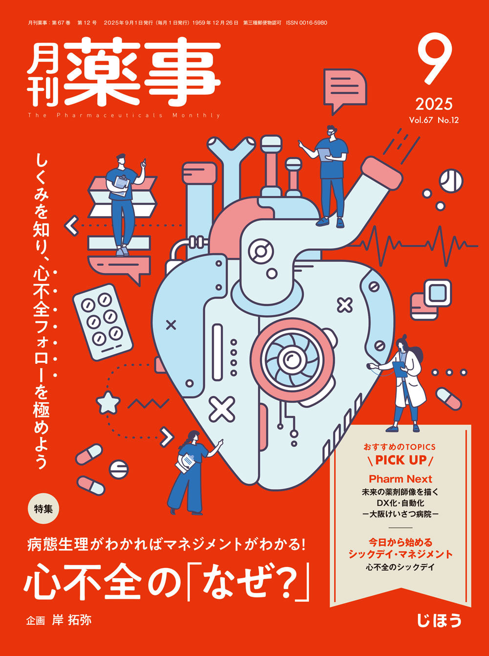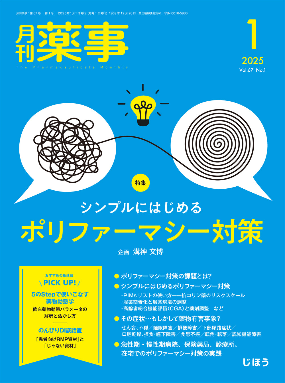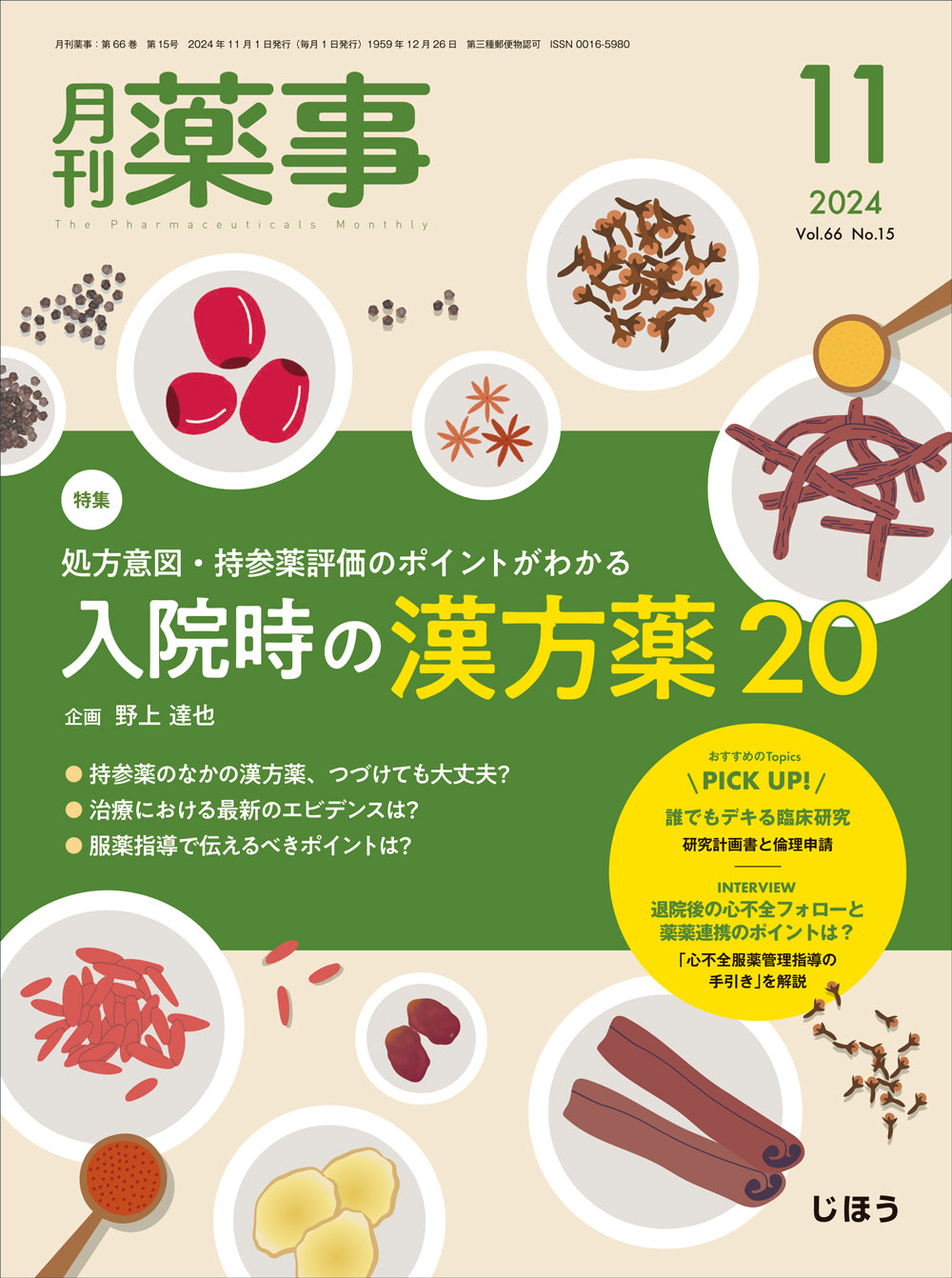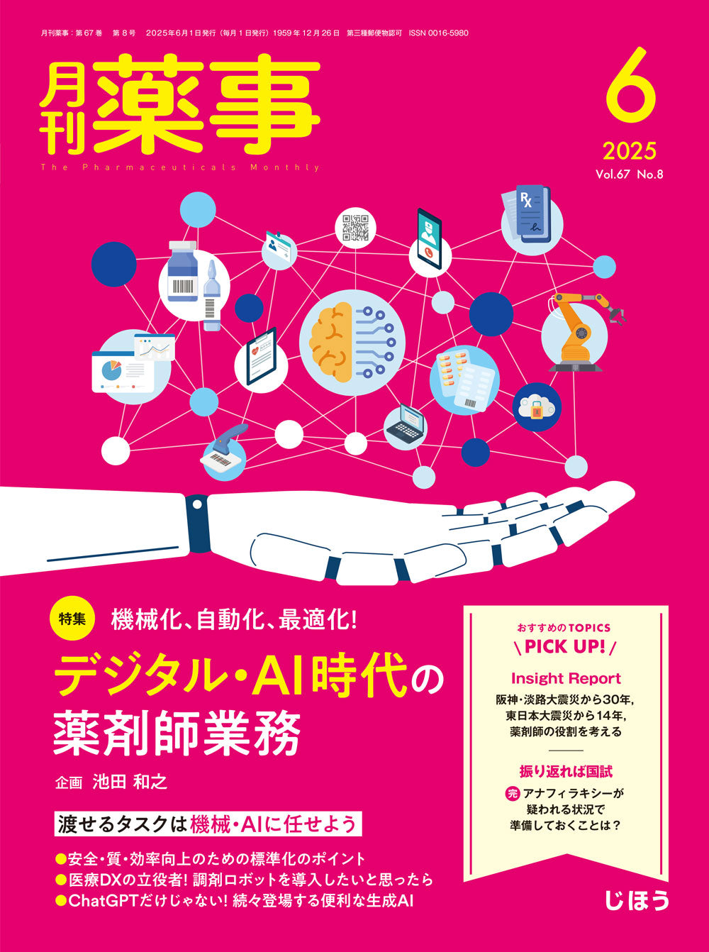 『月刊薬事』は、忙しい臨床現場で活躍する薬剤師の業務を強力にサポートする、最新の薬剤業務関連情報、医薬品情報、医療情報などを提供していきます。さらに、薬学教育、医薬品研究開発や臨床現場での相互連携に欠かせない情報なども盛り込んでお届けします。