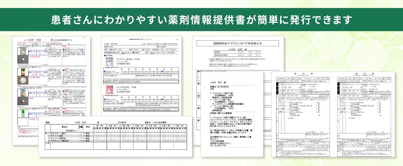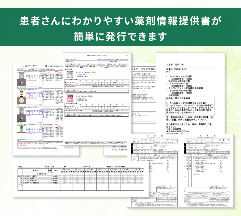 患者さんへのわかりやすい薬剤情報提供のための定番ツール。相互作用のチェックや、「服薬指導せん」「お薬手帳(QRコード付)」が簡単に発行できます。「持参薬管理票」「院外処方箋」等の印刷もできます。